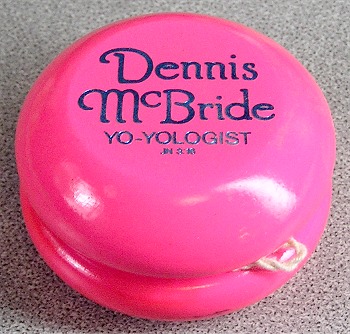 One of the custom models made for National Yo-Yo Master Dennis McBride, by Hummingbird Toys. Dennis McBride's models usually displayed the "Genuine Hummingbird" logo on one side, and his custom logo on the other. This one is a Hot Neon Pink (very tough to photograph) with a Blue foil impressed logo. Very nice combination.