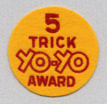 I won this 5 Trick Yo-Yo Award patch from National Yo-Yo in November 1973 on the north-east corner of Dunbar and 41st, outside Nitingale Pharmacy, Vancouver, British Columbia. (The pharmacy is long gone; in it's place now is a used bookstore.) The patch is yellow/orange felt with red flocking of the letters and number. Earning this patch was one of my fondest childhood memories and was the motivation for my lifelong interest in yo-yoing and yo-yo collecting. The instructor/demonstrator who showed up wore a dark navy, waist-length coat (a G9 Harrington jacket made by Baracuta) with a large National Yo-Yo patch sewn on the breast pocket area. An entertaining and nice guy who put on a jaw-dropping demonstration for us kids. I managed to pull off the necessary tricks against 12 other kids to become the "National Yo-Yo Champion" in the neighborhood. (See the National Yo-Yo Champion shield patch.)