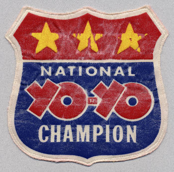 A yo-yo champion award shield given by the Canadian yo-yo company "National Yo-Yo", November 1973. This is the patch/contest that started my life-long interest in yo-yos and yo-yo play. The patch was originally sewn onto the front of a red, short-sleeve t-shirt and presented to the winner which, in this particular case, was me (see the December, 1973 photograph of me wearing the t-shirt, as taken by my father). As an uninhibited 12 year old, I frequently wore the patch shirt and thought nothing of putting it through the wash. After a while the shirt found its way into the "I'll never wear that again" pile of clothes in the bottom of my dresser drawer. Years later, my mother had the foresight to remove the well-worn patch from the shirt and preserve it for me when I cared more about my personal history.