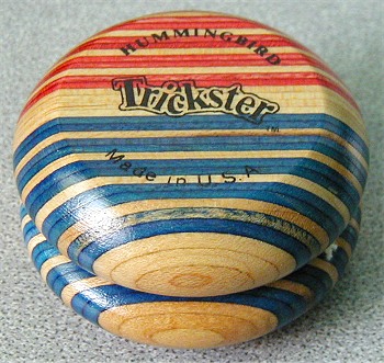 The Hummingbird Trickster was the first production model made from laminated dyed wood. Wood strips dyed in various colors were laminated together, to create the unique designs in the natural wood. Lamination also created a slightly heavier, but stronger product, and was much less resistant to long term shrinkage and warping than yo-yo halves made from one piece of wood.