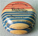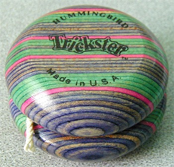 The Hummingbird Trickster was the first production model made from laminated dyed wood. Wood strips dyed in various colors were laminated together, to create the unique designs in the natural wood. Lamination also created a slightly heavier, but stronger product, and was much less resistant to long term shrinkage and warping than yo-yo halves made from one piece of wood.