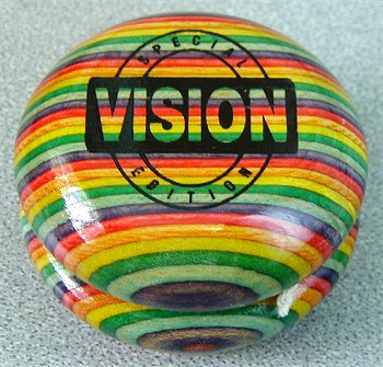 This one is the rarest laminated yo-yo produced by Hummingbird, and one of the most beautiful laminated patterns. Vision asked Hummingbird to produce a custom yo-yo that could be sent to Vision distributors as a Christmas gift. This one was not something sold by Vision. Only about 100 pieces were produced, and none were sold. Produced around 1990 by the late great Hummingbird Factory.