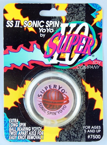 This was the second version of SuperYo's "SS II Sonic Spin" yo-yo. All plastic, including the bearings. Take-apart design. There is no indication on the packaging that this model includes SuperYo's patented IntelliGap(tm) axle system, which actually became available on later released SuperYO models.