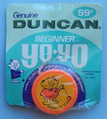 Duncan Beginner undersized yo-yo in orange/red plastic with orange/yellow sticker on one side with the Duncan Yo-Yo Man standing, throwing a yo-yo. His shirt says "Duncan(R)" and below his feet it says "Beginner Yo-Yo". This model came out in the late 1960s, very early 1970s. The saddle header card is among the first released by Flambeau after they purchased Duncan in 1968. It also has the Duncan Yo-Yo Man printed on the card, standing, throwing a yo-yo and he has the "pig style" nostrils on his nose. Front and back of card is identical.