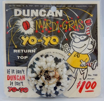 • Duncan Mardi Gras - No. 700 small card exhibit with red, white, and blue plastic bits, and silver glitter |  |