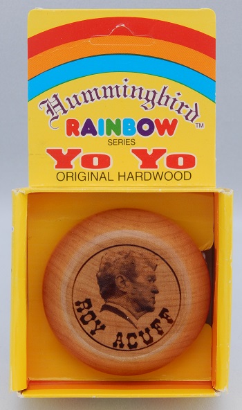 Roy Claxton Acuff was a popular country music singer and entertainer for many years at the Grand Ole Opry, a weekly country music stage concert in Nashville, Tennessee. Mr. Acuff also occasionally used an early 1970s Duncan Butterfly yo-yo during his performances. Hummingbird released the wooden signature yo-yo with his name and likeness on it as seen in this exhibit (though it's unknown if it was released before or after his death on November 23, 1992). The yo-yo was originally sold at the gift shop of the Grand Ole Opry. It came in a plastic bag with a Hummingbird header card stapled to the top of the bag. The version in this exhibit came in Hummingbird packaging which was not how they were ever sold because the box does not have the trick sheet included. In fact, the "Trick sheet included" text on the packaging has been blacked out with a marker pen.