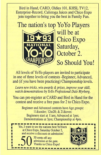 1993 was the first year of the National Yo-Yo Championship held in Chico, California. The front of the flyer describes the upcoming contest; the back of the flyer describes the tricks required for each level.