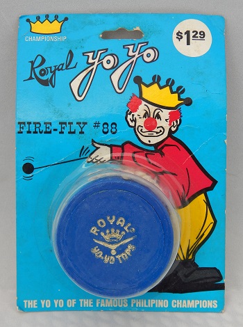 Royal "Fire-Fly" plastic yo-yo, model 88 with text and a five-point crown with chevron image hot stamped on the yo-yo. The Fire-Fly was a bow-tie configured yo-yo from the early 70s. Hard to find. At the time, Royal was operating out of 503 Main street, Covington, Kentucky. Card was pre-printed with the price of $1.29.