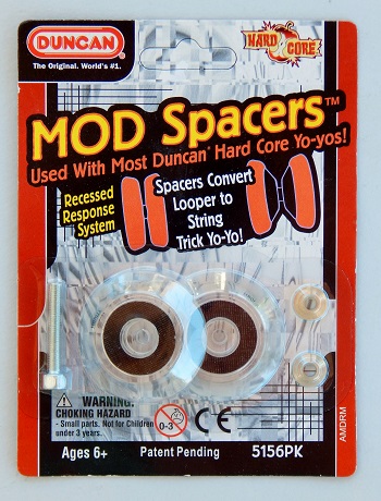 The Duncan clear MOD Spacers kit 5156PK included a long axle screw, two metal bearing spacers, and two plastic MOD Spacers. The MOD Spacers used recessed silicone response pads for the response. Because this kit does not come with a bearing like the Duncan MOD Spacer kit model 5158PK, you must use the bearing that already comes with your yo-yo.