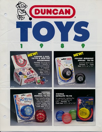 Duncan Toys 1989 product catalog. This catalog was sent directly to me from Duncan. Note in the catalog that the Duncan Li'l Champ yo-yo -- a staple in the Duncan product line for more than 20 years -- was discontinued as denoted by the hand-drawn "X" made by a Duncan employee. A 1990 yo-yo and spin top price list is also included at the end of the PDF. Notice that there is no website address printed anywhere. Within five or six years that would change with Duncan registering the now famous URL www.yo-yo.com as their official website.