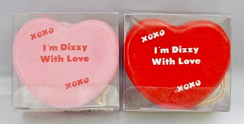 Pink and red wooden, heart-shaped yo-yos for Valentine's Day. Made by Papel Freelance, Inc. based out of Cranbury, New Jersey. Papel designed, manufactured, and distributed a variety of social expression giftware for everyday occasions and holidays.