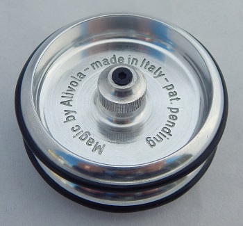 Magic made by Alivola, a kite/toy company started by Guido Accascina of Italy. Guido graduated with a degree in engineering and is primarily known for his kite designs. However, in 2000, during the yo-yo boom across North America, Japan, and Europe, he used his engineering background to create the aluminum Magic, released by his company Alivola. The model was not a big success however (unresponsive, dead yo-yos were just starting to come onto the yo-yo scene) and Guido returned to his primary passion: kites. Today (2020), the Magic is a very hard-to-find yo-yo. In terms of yo-yo history, it's quite an interesting example of early modern Italian yo-yo design. After the Magic's release, it was several years before another Italian yo-yo company, Oxygene, actually made it big on the yo-yo scene.