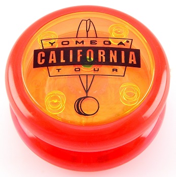 Body is translucent pink with translucent neon yellow sidecaps with the Fireball logo in black on one side and the "Yomega California Tour" in black on the opposite side.