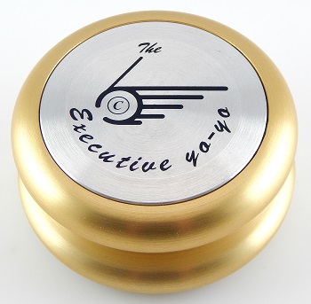 | From millenniumyoyo.com: "The Executive Yo-Yo was Millennium's first production yo-yo. It was designed for the man who has everything. It was made from aluminum having anodized bodies and polished side caps. One side is printed with the words 'The Executive Yo-Yo'. The main feature of this yo-yo is its auto return system. An inertia clutch is released when the yo-yo is thrown, allowing the yo-yo to 'sleep'. Then, as the yo-yo slows dow, the clutch bites the nylon bearing and returns the yo-yo to your hand with a fierce snap. The Executive Yo-Yo came in six stunning anodized colours: Blue, Gold (seen in this exhibit), Green, Pink, Purple, and Red. It was presented in an textured black box with a black satin lining.