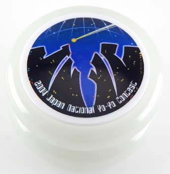 | Glow in the dark Yomega  Fireball with side A cap featuring the 2004 Japan National Yo-Yo Contest logo. The abbreviation "JNYC" is depicted on the cap as skyscraper buildings in black with yellow office lights. Side B side cap featured the Yomega logo.
