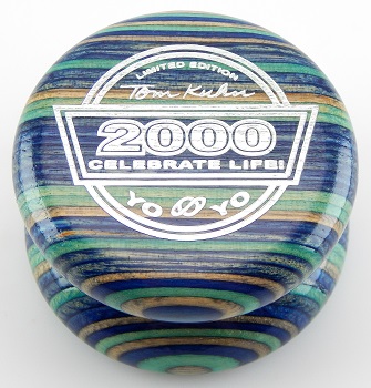 The Tom Kuhn 2000 - Celebrate Life! (Limited Edition). Dyed, laminated maple in blue, teal/mint, and natural. Fixed-axle. Used a silver-foil cap stamp that was unique to this model. Made by BC/What’s Next Mfg. in New York, circa 1999–2000. Laminated wood appeared often in BC’s product line, but this particular Tom Kuhn edition is now quite hard to find.