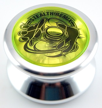 Turning Point's Stealth Remix yo-yo (with signed card), the signature model of Kenichi Nakamura. It was a special collaboration model designed in Japan. Interestingly, the design follows the Yomega Stealth Raider model, which was popular during the first Hyper Yo-Yo boom in the late 20th century and early twenty aughts. It combines Turning Point's unique designs with Nakamura Meijin's specific attention to detail. The yo-yo featured an aluminum body and removable plastic translucent yellow side caps with a graphic design. Came with signed card from Kenichi.