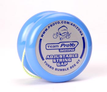 Special release for Team ProYo Arizona. Adjustable String Gap (ASG)Bee GTs are hard to find, as each one had to be modified to ASG by hand. Only two Bee GT releases were enhanced to ASG, this release and the Dave's World of Yo-Yos release. Both were made from these limited run cornflower blue Bee GT halves. Team Proyo Arizona was run by World Team Proyo demonstrator, Kate Miller.