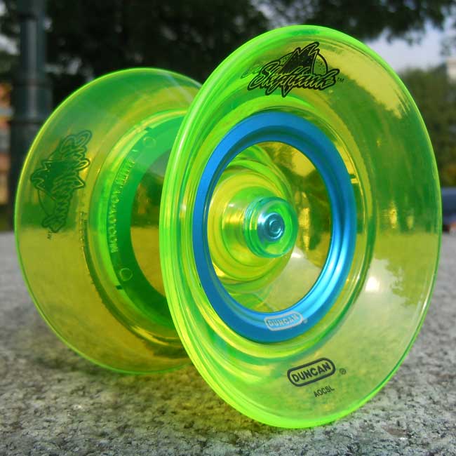 The SkyHawk is an off-string (4A) yo-yo, part of Duncan's Hardcore line. Made of durable polycarbonate the SkyHawk is a super wide V shape, and uses SG silicon response and a large bearing. It has flippable spacers to narrow the gap and accept a small bearing preferred by some off-string players (small bearing not included).