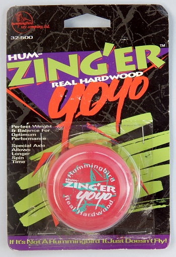 The HumZinger was the last new model released by Hummingbird. The yo-yo only reached the stores briefly before Hummingbird went out of business. This particular release is a fixed axle reddish pink wooden yo-yo with a splash of greenish blue paint on each halve.