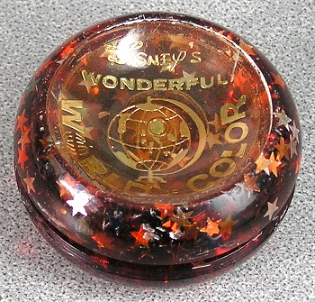 The World of Color was a very unusual item from the old Duncan company, and one of my personal favorites. The halves were poured and molded, so the mix of glitter and foil stars could be mixed into the translucent plastic. The effect was dazzling, and many colors were produced. The side logos were different on each side, and the clear plastic caps were printed in reverse on the inside to protect the logos from wear. The caps are concave inwards, giving the yo-yo a totally unique feel.