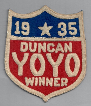 Beware of fakes! A highly questionable 1935 version exists that is noticably newer and poorer in stitching and overall vintage quality when compared to the version in this exhibit. The dubious 1935 version shows absolutely no aging whatsoever -- very suspect for an 85+ year old patch. Now compare the reverse side of the patch that you see in this exhibit with the reverse side of another questionable 1935 version. Clearly the two 1935 patches in the other exhibits are fake, so beware if you're a yo-yo patch collector.