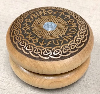 Bifrost and Nordik designs were an attempt to do Viking style art. Fused with the Celtic influence and with Runic Alphabet. The text reads "Tom Kuhn Custom Yoyos Bifrost" in Viking runes.