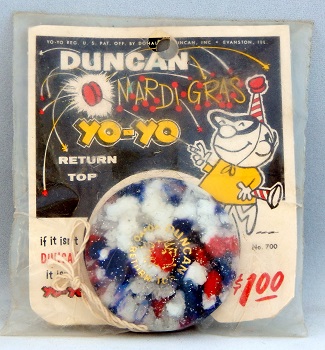 Duncan Mardi Gras on a small card that measures 95 mm wide x 108 mm tall. The small card version of this yo-yo is quite hard to find.