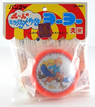 The Paul's Miraculous Adventure yo-yo from Bandai, licensed from Tatsunoko Production Company of Japan. The yo-yo is based on the anime television series "Paul's Miraculous Adventure" that aired on Fuji Television from October 3, 1976 to September 11, 1977. Seen behind the clear lens sidecap of the yo-yo are the show's main characters from the series: Nina, Paul, Pakkun (the pink-faced teddy bear), and Doppe or Doppy (pronounced dopey; a Saint Bernard dog). The kanji above the characters on the yo-yo translates to Paul's Miraculous Adventure; the kanji below the characters translates to Copyright Tatsunoko.
