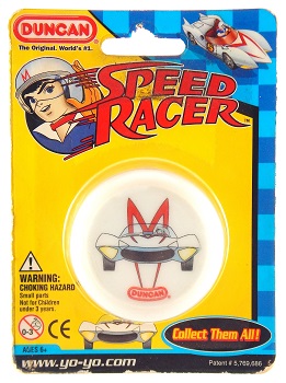 Essentially a plastic, fixed wooden axle Duncan ProYo model with glow in the dark body. The side cap features a full frontal view of Mach 5, the race car used by Speed Racer in the anime series by the same name.
