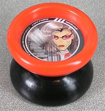 This is YoYoJam's all plastic yo-yo shaped like the popular Hitman. Concave shaped, Bearing axle, adjustable gap, take apart design, large diameter bearing, and double YoRing response system. A wide color range on these, from lighter to darker. On the red, many look almost orange. This one is a typical orange red Lyn. |  |