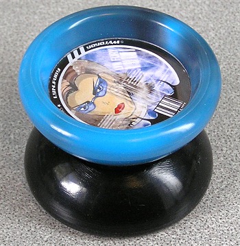 This is YoYoJam's all plastic yo-yo shaped like the popular Hitman. Concave shaped, Bearing axle, adjustable gap, take apart design, large diameter bearing, and double YoRing response system. This one is a transition color with black mixed into the normal blue.