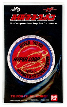 Made by the Apparel Division of Bandai Co. Ltd. in 1998, the four-colored Playmaxx Hyper Loop patch showcased one of more than 20 different Hyper Yo-Yo-themed iron-on patches that were sold at Bandai trick certification centers inside retail stores. It's possible that these patches were also used as prizes in yo-yo contests. Sometimes the patch highlighted a particular yo-yo model—such as the one seen in this exhibit—that was licensed by Bandai from either Yomega or Playmaxx of the U.S.A.