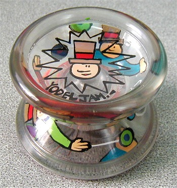 This is one of John's clear YodelJams, and the clears show his mastery of the medium. Images painted on the inside of the yo-yo's surfaces are visible and fully characterized from inside, or out. YodelJam logo on one side, and standard Big Ben logo on the other.