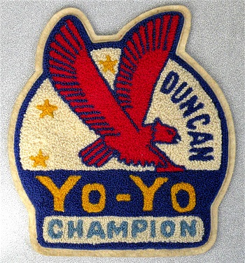 The Giant Eagle patches were the largest of the Duncan patches, and highly sought after by competitors in the 1950's, and now by collectors. The Giant patches were a velour patch, with a thick textured face, sewn to a thick felt backing. These were usually affixed to a Duncan sweater, but I have also heard that some were awarded as patches.