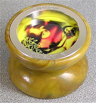 The Remix was the first Buzz-On model to feature their SPR axle system with a medium sized bearing. Like most of the Element X line, colors varied widely. Very many combinations of body color, weight ring color, and logo color. Pictured here is a Marbled Yellow Brown Remix.