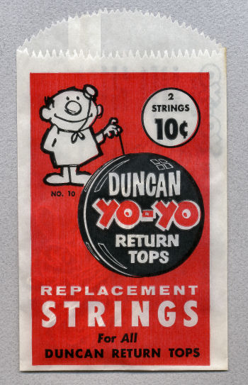 A vertical string pack with "No. 10" below the Duncan Yo-Yo Man's feet. This was the last design sold by the original Duncan company in Luck, Wisconsin before Flambeau Plastics acquired the brand several years later.