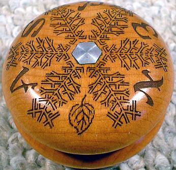 This was produced in promotion of Aspen, Colorado (hence the snowflake design and Aspen leaf.) Of the early mandalas, this is one of the rarest and most difficult to find. Same features as the standard Mandalas and No Jives, with reversible halves and replaceable axle.