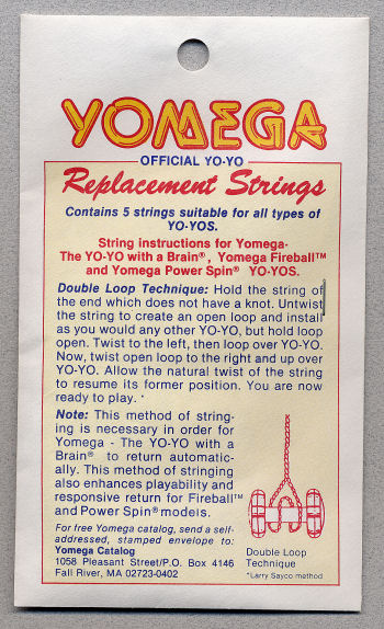 An early Yomega replacement string pack for the Brain, Fireball, and Power Spin yo-yo models. Those three models were the extent of Yomega's yo-yo product line back in the mid 1990s.