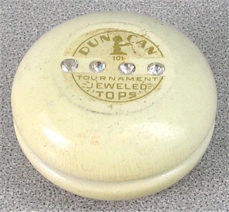 The 101 Jeweled Tournament is the rarest of the jewelled Duncans. This jewel was made for sale in Canada. Notice that it does not have the word "yo-yo" on the logo, because that word was trademarked in Canada. To add to the collectibility, the decal also featured the nostagic Mr. Yo-Yo character on the logo, like the yellow seal 77s of the time.