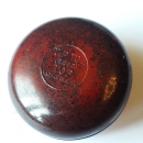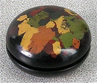 The Tip Toe Top was an undersized yo-yo made in England. The halves were solid with color swirls in body, similar to some of the other bakelite yo-yos of the time. The logo is raised, so difficult to read, but look at the logo closeup to read the full text. The axle was metal, embedded into each solid side. It was also meant as a fixed string yo-yo. Note the hole through the axle to thread string in the Profile View.