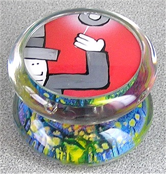 One of Mr.Yodel's custom designs from 2005. John Higby has been well know for his painting and custom yo-yos since the early days of Proyo. He paints the "inside" of clear yo-yos for a radiant effect on the outer surface, and usually adds one of his custom sidecaps as well. He turns standard clear releases into Yo-Yo Art. This is painted and "yodelized" Duncan FreeHand 2 with bearing axle and weight distribution.