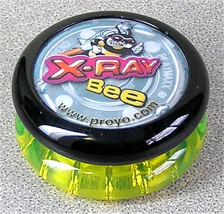 Pictured here is the Smoke and lime version, made like this to be similar in look to the standard Bee. Notice the logo shows the domain name of www.proyo.com. An earlier very limited release of the X-Ray Bee was sold only at the Proyo Worlds in 1999, and did not have the domain name on that logo.