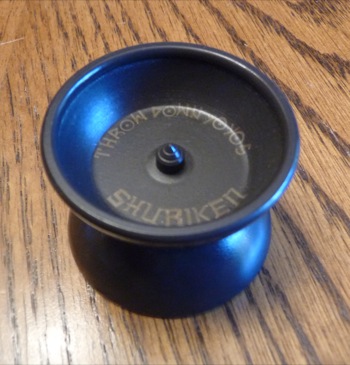 The Throw Down Shuriken was the 2nd release by Throw Down Yo-Yo's. It was a 'micro' yo-yo, slightly larger than the Tom Kuhn Pocket Rocket, and made of carbon steel. Since the material oxidizes quickly, the Shuriken was coated in manganese phosphate (gun metal), and then clear coated, resulting in a very unique finish.