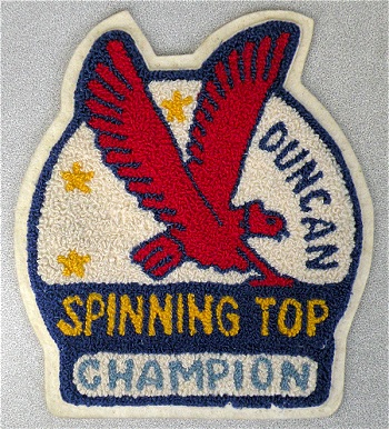The Giant Eagle patches were the largest of the Duncan patches, and highly sought after by competitors in the 1950's, and now by collectors. The Giant patches were a velour patch, with a thick textured face, sewn to a thick felt backing. These were usually affixed to a Duncan sweater, but I have also heard that some were awarded as patches.