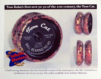 This is a pre-release promotional post card by Infinite Illusions promoting Tom Kuhn's new Tom Cat yo-yo. The front of the postcard has promotional pictures and general info about the Tom Cat. On the back of the Card is a detailed report about the specifics of the upcoming yo-yo that including production runs variations and other up and coming yo-yos .
