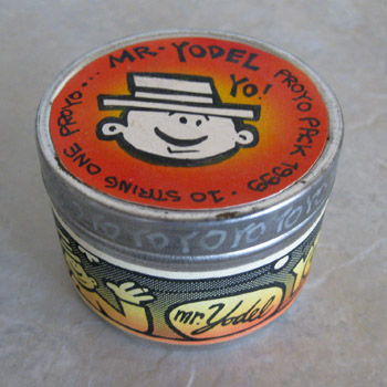 John Higby sold these "Pro Pack" containers for a few years around 1999. Each container included a Custom painted and poged proyo along with 5 strings hand dyed by Higby. The container itself was a work of art as it had many examples of Higby art with four different sticker designs on each container as well as art written directly on the container. The stickers and drawings could be found on the top, bottom and the side as well as on both inside faces of the container. This is a definite must have for the Higby collector.