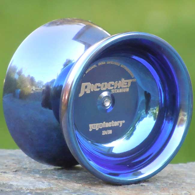 The Ricochet is YoYoFactory's first attempt at a 100% titanium yo-yo. Slightly undersized, the Ricochet is available in silver (raw) and blue (anodized), with the blue having a very iridescent look to it.