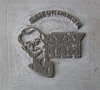 This is the die stamp used to produce the Yo-Yo Man logo side of the Second release of the Hummingbird Smother's Brothers Yo-Yo Man Yo-Yo. The second release logo did not have a ring around the logo, and "Hummingbird" was added to the logo. The logo is etched on the plate in reverse. In this case gold foil was impressed onto the yo-yo half with the plate. A "one-of-a-kind" Hummingbird Collectible.