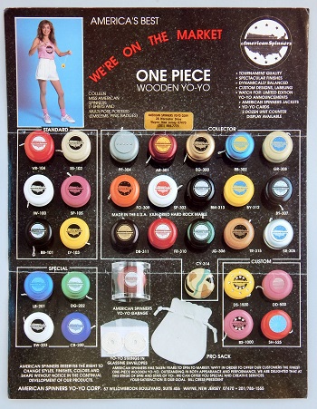 American Spinners Yo-Yo Corp. was based out of Wayne, New Jersey in the late 1980s and early 90s. The company produced some excellent playing wooden yo-yos in spectacular paint finishes. Some of their yo-yos can be seen in this museum. They offered Standard, Collector, Special, and Custom versions.